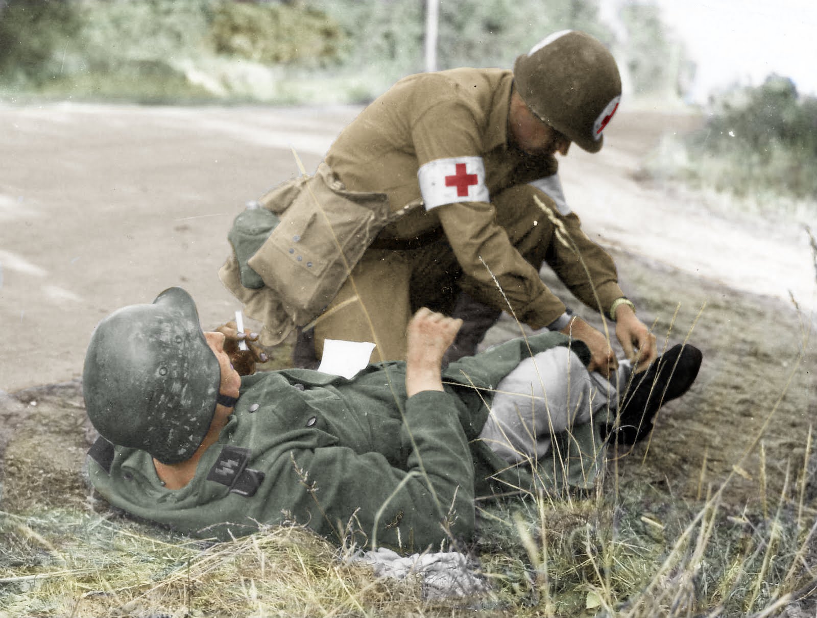 Een Amerikaanse soldaat helpt een gewonde Duitse soldaat in 1944