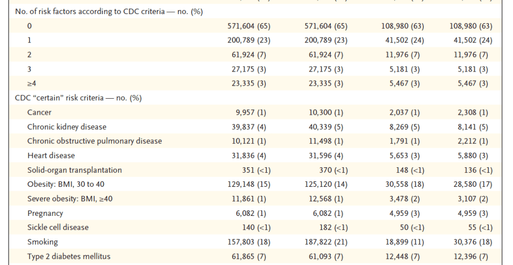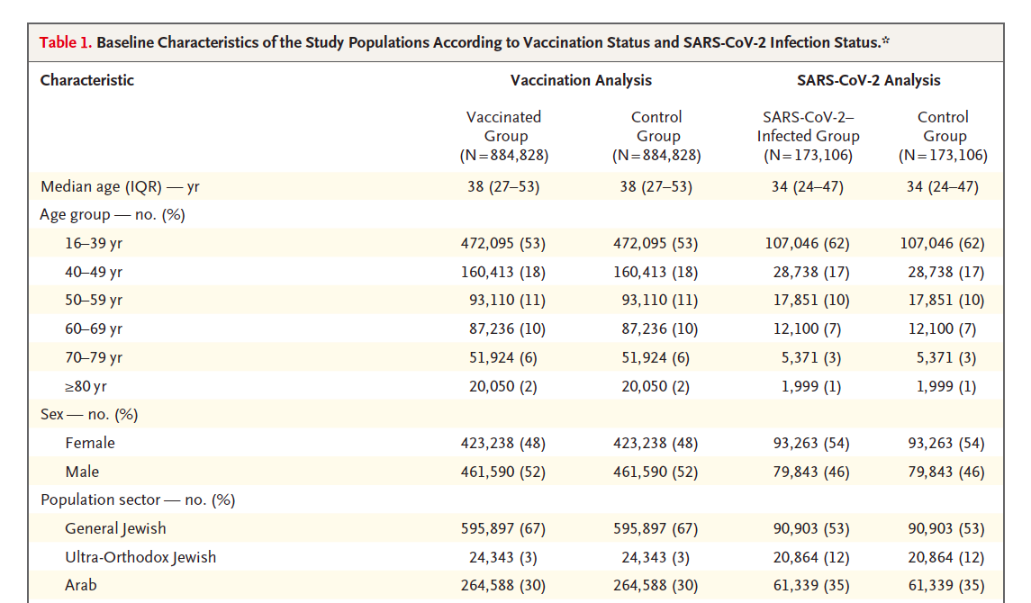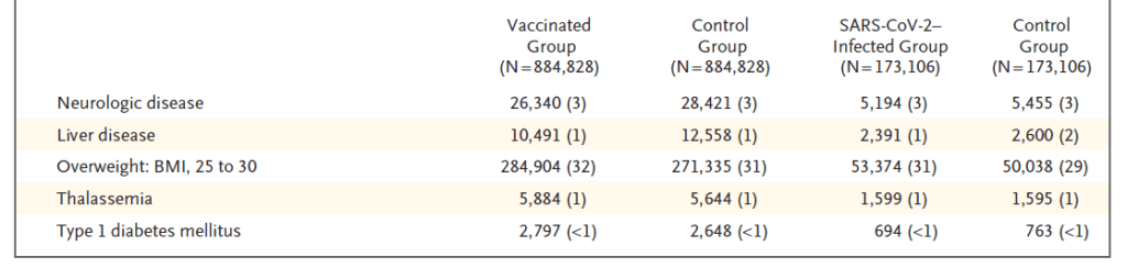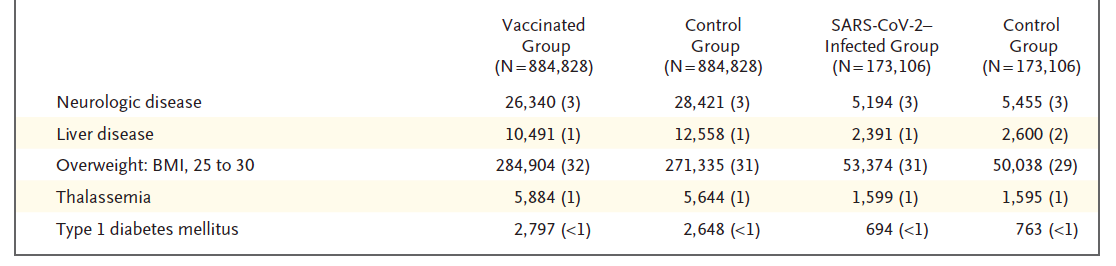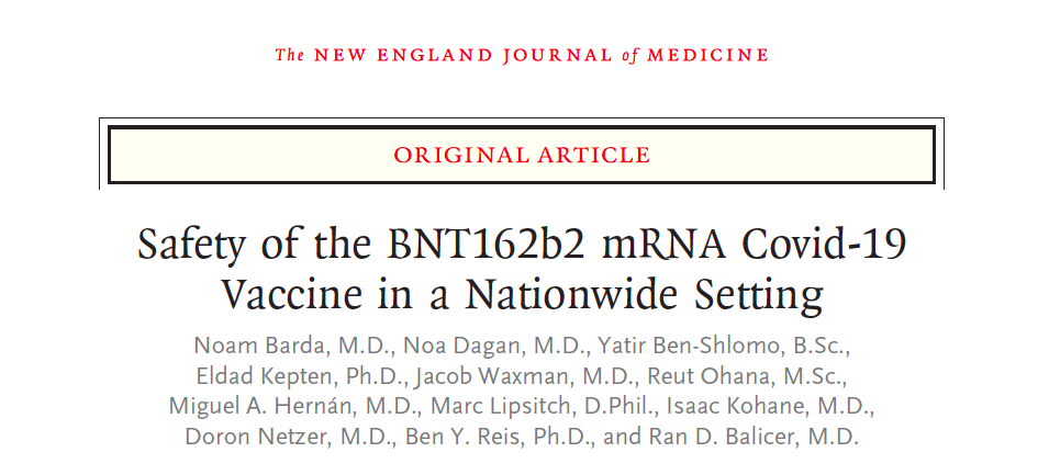 De analyse van uitkomsten van vaccinatie. 884,828 mensen ouder dan 16 jaar werden vergeleken met 884,828 nauwkeurige geselecteerde ongevaccineerde mensen. De twee groepen kwamen nauw overeen op socio-economische, geografische en gezondheid gerelateerde aspecten. Er werd gekeken naar 25 potentiele bijwerkingen of complicaties van het toegediende vaccin. De analyse liep van 20 december 2020 tot 24 mei 2021.