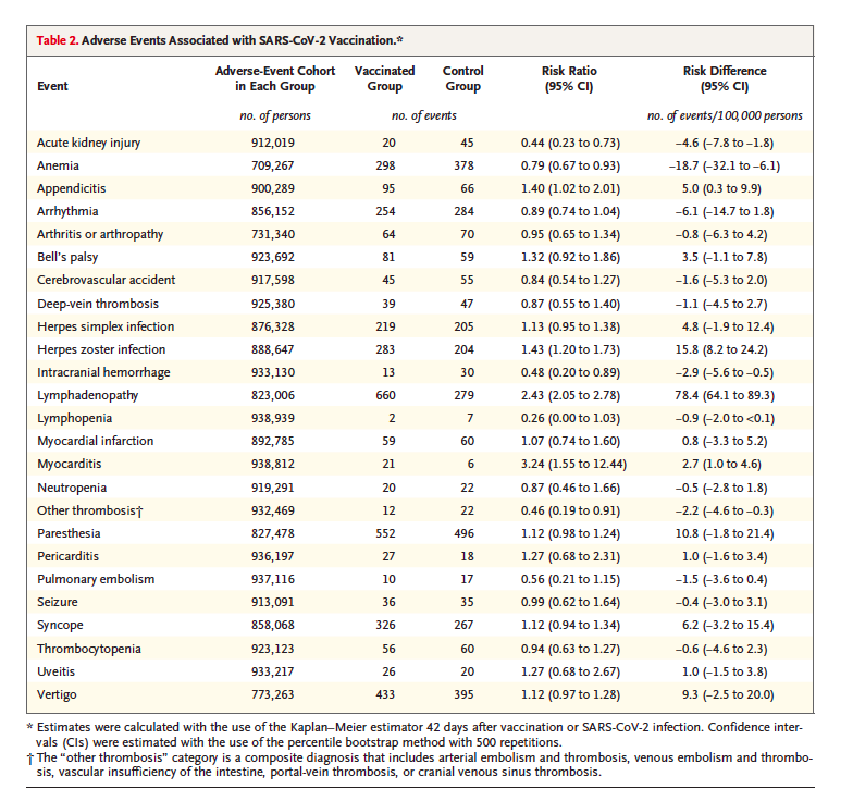 2. Myocarditis (ontsteking van de hartspier) was duidelijk geassocieerd met het vaccin, maar was zeldzaam in 2.7 gevallen per 100.000 vaccinaties en dan vooral bij mannen tussen 22 en 34 jaar. Men moet zich realiseren dat myocarditis is ook een risico na infectie met SARS-CoV-2. In de groep ongevaccineerde maar met het virus besmette personen kwam dit in 11 gevallen per 100.000 personen voor. Maar men moet zich hierbij ook realiseren dat jonge mannen vrijwel geen risico lopen op ernstige COVID-19.